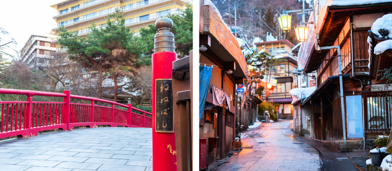 温泉街の入り口で写真映えスポットが多数で、朝は人が少なく歩きやすいのでおすすめ。